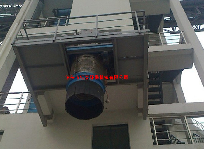 伸縮溜管采用雙層套管結(jié)構(gòu),由溜筒和防塵罩構(gòu)成。溜筒內(nèi)通過物料,防塵罩外套在溜筒上,期間行程吸塵腔。無塵伸縮溜管底部將設(shè)料位傳感器和防塵群罩。料位傳感器將設(shè)在外側(cè)或內(nèi)側(cè),防塵群罩將采用分塊重疊式。在裝車過程中料位傳感器接觸物料后,無塵伸縮溜管將及時提升使料頂與堆積的物料始終保持一定距離。防塵罩能罩在料堆上,以保證吸塵效果,防止粉塵外溢。溜筒將采用附有聚氨酯耐磨襯板的鋼板制成,防塵罩采用防靜電柔軟強度大的化纖材料制成。防塵罩內(nèi)將設(shè)置支承骨架,既可上下伸縮,又可保證氣流通暢。伸縮溜管升降自如,無阻滯現(xiàn)象;在伸縮溜管底部將至少設(shè)3個吊點,以保證升降機構(gòu)帶動伸縮溜管平穩(wěn)升降。伸縮溜管外形尺寸圖/外伸縮防塵罩圖片