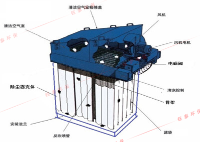 含塵空氣由風(fēng)口進(jìn)入除塵器箱體內(nèi),細(xì)小塵粒由于濾袋的多種效應(yīng)作用,被滯阻在濾袋外壁。凈化后的氣體通過(guò)濾袋從上箱體出風(fēng)口排出。隨著使用時(shí)間的增長(zhǎng),濾袋表面吸附的粉塵增多,濾袋的透氣性減弱,使除塵器阻力不斷增大。為保證除塵器的阻力控制在限定的范圍之內(nèi),由脈沖控制儀發(fā)出信號(hào),循序打開(kāi)電磁脈沖閥,使氣包內(nèi)的壓縮空氣由噴吹管各噴射到對(duì)應(yīng)的骨架(稱(chēng)為一次風(fēng)),并在高速氣流通過(guò)骨架時(shí)誘導(dǎo)數(shù)倍于一次風(fēng)的周?chē)諝猓ǚQ(chēng)為二次風(fēng))進(jìn)入濾袋,造成濾袋瞬間急劇膨脹,由于反向脈沖氣流的沖擊作用很快消失,濾袋又急劇收縮,這樣使積附在濾袋外壁上的粉塵被清除。由于清灰是依次分別向幾組濾袋進(jìn)行,并不切斷需要處理的含塵空氣,所以在清灰過(guò)程中,除塵器的處理能力保持不變。