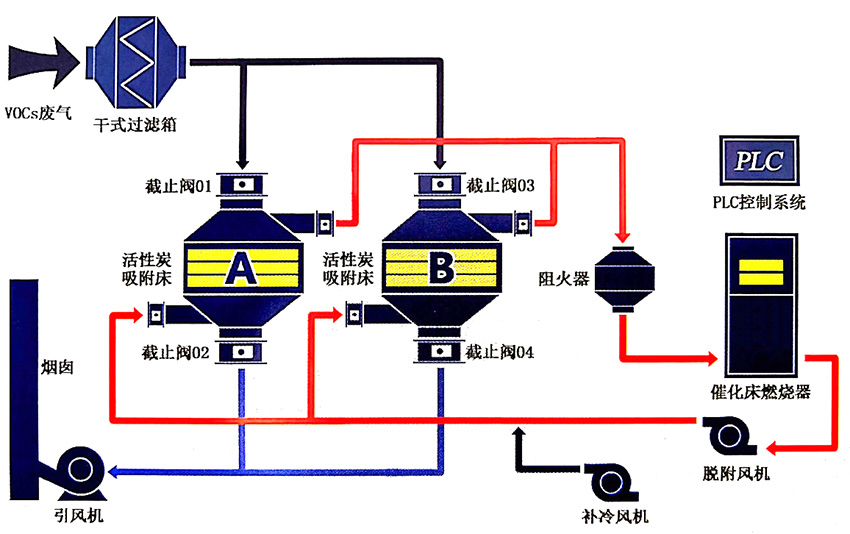 活性炭吸附脫附?催化燃燒裝置是根據(jù)吸附(效率高)和催化燃燒(節(jié)能)兩個(gè)基本原理設(shè)計(jì),采用雙氣路連續(xù)工作,一個(gè)催化燃燒室,兩個(gè)或多個(gè)吸附床交替使用。脫附下來的有機(jī)物已被濃縮(